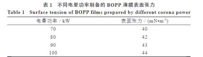 電暈功率的變化引起了BOPP薄膜表面化學(xué)組成的變化,會進(jìn)一步導(dǎo)致BOPP薄膜表面張力的改變。為了考察電暈功率對BOPP薄膜表面張力的具體影響規(guī)律,測試了在47℃預(yù)熱溫度條件下用不同電暈功率制備的BOPP薄膜剛下線時(shí)的表面張力,結(jié)果見表1。
