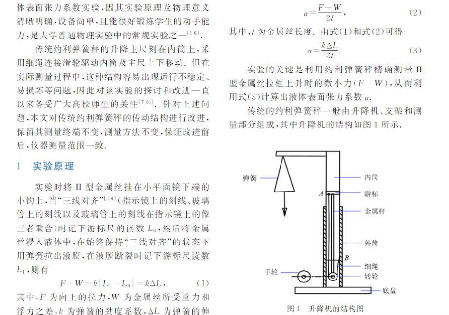 約利彈簧秤是一種精細(xì)彈簧秤,常用來(lái)測(cè)定微小的力。利用約利彈簧秤采用拉脫法測(cè)量液體表面張力系數(shù)實(shí)驗(yàn),因其實(shí)驗(yàn)原理及物理意義清晰明確,設(shè)備簡(jiǎn)單,且能很好鍛煉學(xué)生的動(dòng)手能力,是大學(xué)普通物理實(shí)驗(yàn)中的常規(guī)實(shí)驗(yàn)之一。