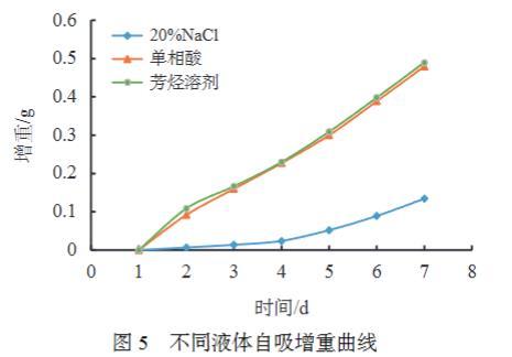 設置不同液體進行自吸實驗,對比親油巖心對于不同液體的自吸能力,實驗結果見圖5。對孔隙介質而言,潤濕性控制兩相或多相流體的分布和流動。平衡時濕潤相與孔隙表面相互接觸,而非濕相占據孔隙的中央位置,介質中發生兩相或多相流動時,毛管力與濕相流動方向一致,是非濕相自發進入巖心介質驅替潤濕相的阻力,對于油濕巖心介質,很難發生水的自吸。從實驗結果可以看出,單相酸自吸效果和芳烴溶劑十分接近。