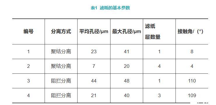 聚結(jié)式濾紙分離水的主要步驟為:(1)從不混溶的液體中傳輸小水滴到過濾器;(2)小水滴附著在纖維表面;(3)因聚結(jié)使附著在纖維上水滴的尺寸增加;(4)水滴在纖維上的合并和傳輸;(5)水滴因?yàn)橹亓γ撾x濾紙表面落到集水槽內(nèi)。阻攔式濾紙分離水的原理是利用疏水纖維的疏水性,把水顆粒阻攔在濾紙表面,通過黏性聚結(jié)生長成的大水滴在重力的作用下脫離濾紙表面。