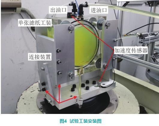 單張濾紙工裝由兩塊50 mm厚的有機(jī)玻璃制成,在頂部加工進(jìn)出油口,在底部加工放水口。單張濾紙工裝和振動試驗(yàn)臺通過一個特制的鋁質(zhì)底座進(jìn)行連接,如圖4所示。