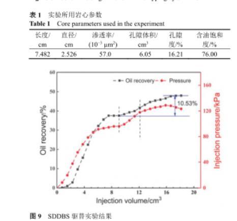 結合上述研究,選取0.02%(w)SDDBS溶液作為驅油劑進行巖心動態驅替實驗.本實驗使用的巖心參數如表1所示.驅替實驗共分為三個過程:模擬地層水驅、表面活性劑驅、后續模擬地層水驅.驅替結果如圖9所示,初期地層水驅,當采出液含水率>98%時,計算采收率為37.36%.當注入3.025 cm3 SDDBS溶液后采收率提高至41.67%,注入壓力升高.恒溫保持12 h后進行后續水驅,注入壓力逐漸升高,且當采出液含水率>98%時,計算采收率為47.89%.說明SDDBS溶液驅在水驅基礎上提高采收率10.53%,具有優異的驅油效果.