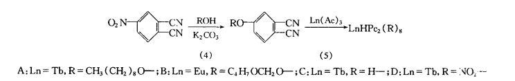 配合物A、B的合成:以鄰苯二甲酰亞胺為原料,經硝化、氨解、脫羰基、取代等反應,合成正壬氧基鄰苯二腈和4-氫糠氧基鄰苯二腈。在氮氣保護下,取代鄰苯二腈和醋酸稀土(Tb、Eu)(III)以8:1的摩爾比在260℃反應6h,得綠色固體,溶于氯仿中。經Al?O?(100目)色譜柱分離,收集綠色溶液,蒸干溶劑,得綠色粉末,經元素分析、紅外光譜和質譜加以確認。合成路線如下: