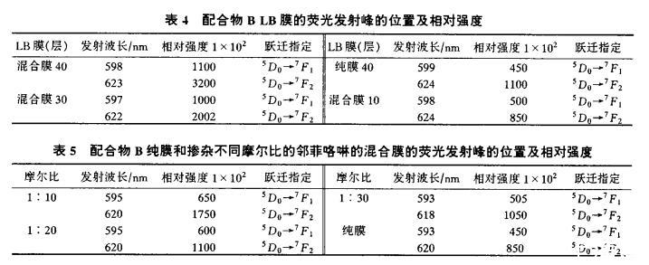 配合物B和鄰菲咯啉摩爾比為1:10時,制成40、30、10層混合LB膜,與40層純膜進行比較。結果表明(表4):同層數的混合膜與純膜相比,混合膜的熒光性遠高于純膜。實際上,30層的混合膜熒光強度就比純膜40層的強。說明鄰菲咯啉吸收能量后再傳遞給稀土離子,起著分子間傳遞能量的作用。使混合膜的熒光強度增加。當配合物與鄰菲咯啉的摩爾比變為1:20和1:30(20層)時,熒光強度反而下降(表5)。