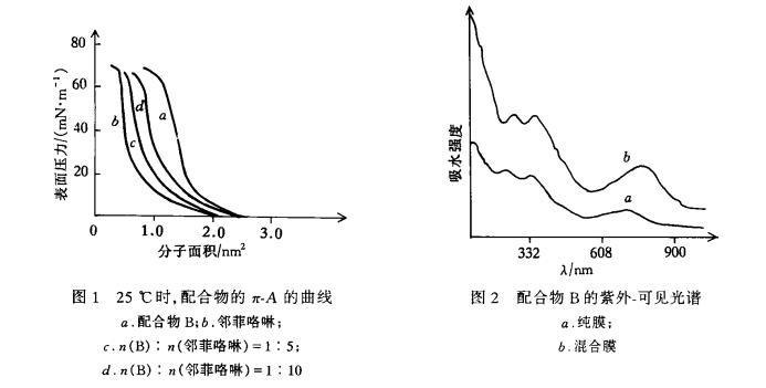 將稀土雙酞酞菁衍生物配成濃度為0.1g/L的氯仿溶液,按照不同的摩爾比將鄰菲咯啉加入溶液中。樣品槽和基片在索氏提取器中用異丙醇回流數小時后,分別用氯仿、甲醇、純水超聲10min。在KSV-5000雙層拉膜機上,用微量進樣器,將溶液小心滴加到清潔的水面上,待氯仿完全揮發后,進行π-A曲線測定。LB膜的組裝,表面壓力均為20mN/m,提拉速度為5mm/min,用垂直拉膜法,以Y型沉積方式,在石英基片上,制成不同層數的LB膜。該膜用于紫外-可見和熒光輻射測量(狹縫長2mm,激發波長375nm)。