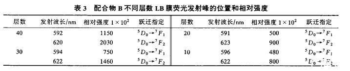 表3配合物B不同層數LB膜熒光發射峰的位置和相對強度