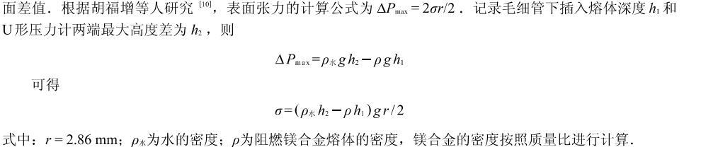 工業(yè)純Mg熔化后在750℃左右加入Mg-30%Ca和Mg-30%Ce中間合金,待金屬完全熔化后攪拌均勻,去除表面熔渣,保溫10 min后進(jìn)行表面張力的測量.測量時首先打開氬氣瓶,通過一系列的量程裝置、U形管兩邊液面波動情況和熔體中產(chǎn)生氣泡的速度來調(diào)節(jié)氣體流量大小,以阻燃鎂合金熔體表面每分鐘產(chǎn)生8~10個氣泡為準(zhǔn)。記錄下毛細(xì)石英管插入到熔體內(nèi)部的深度和U形管兩端的最大液面差值。