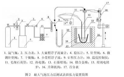本研究采用“最大氣泡壓力法”測量阻燃鎂合金熔體的表面張力。實(shí)驗(yàn)裝置見圖如圖2所示。采用高純度氬氣作為工作氣體,干燥瓶中裝有CaCl2用于干燥氣體,毛細(xì)石英管直徑為2.86mm,端口經(jīng)過拋光、清洗處理,U形壓力計(jì)工作液體為純凈水。