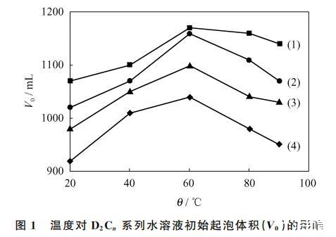 圖1 溫度對(duì) D2Cn 系列水溶液初始起泡體積(V0)的影響