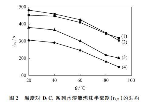 由圖1和圖2可知,隨著溫度的升高,D2C水溶液的初始起泡體積先增加,在60℃達(dá)到最大值后又有所下降,但是上升和下降的幅度不大;隨著溫度的上升,D2C水溶液的泡沫半衰期顯著下降。這是由于在一定的溫度范圍內(nèi),隨著溫度的升高,液體膨脹,分子間距離增大,表面活性劑分子動(dòng)能增加,易擺脫水的束縛逃逸到水面,表面吸附量增加,起泡能力增強(qiáng)。另外,泡沫在低溫和高溫下的衰變過程不同。低溫時(shí),主要是氣體擴(kuò)散過程;高溫時(shí),由于最上面的泡膜上側(cè)總是向上凸的,這種彎曲面有利于蒸發(fā),溫度越高蒸發(fā)越快,液膜越來越薄,最后自行破滅,因此泡沫破滅由頂端開始。從起泡體積和泡沫半衰期隨溫度的變化曲線來看,D2C系列中D2C2的變化趨勢最為平緩,即抗溫能力最好。