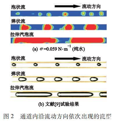 通道內(nèi)沿流動方向依次出現(xiàn)的流型如圖2所示,圖2a為σ=0.059 N·m?1(純水)條件下,數(shù)值計(jì)算得到的微通道內(nèi)汽液兩相呈現(xiàn)的流型。不難看出:沿流動方向依次出現(xiàn)泡狀流(汽泡呈球形)、彈狀流(汽泡呈前端橢球,中間圓柱體,尾端近扁平狀)和拉伸汽泡流(汽泡在微通道內(nèi)受限,呈拉伸的柱形)3種流型。這與通過沸騰試驗(yàn)得到的490μm矩形通道內(nèi)觀測段的流型及汽泡形態(tài)(圖2b)一致。此外,數(shù)值模擬結(jié)果還與其他文獻(xiàn)中的試驗(yàn)結(jié)果進(jìn)行比對,結(jié)果表明:計(jì)算模型與數(shù)值方法可行,計(jì)算結(jié)果與試驗(yàn)數(shù)據(jù)吻合較好。