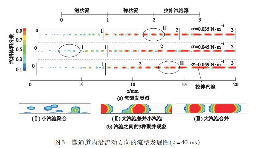 首先從汽泡在微通道的演變與流型發(fā)展的特征入手,討論不同表面張力下,矩形微通道內(nèi)沿流動方向的汽液兩相分布變化的差異。圖3a給出了σ分別為0.035,0.045,0.059 N·m?1時(shí)各自的汽泡演變與流型發(fā)展的計(jì)算云圖(t=40 ms),圖3b為汽泡脫離壁面后的3種不同的聚并現(xiàn)象,I,II,III分別對應(yīng)于剛脫離加熱壁面的小汽泡之間的聚并、較大尺寸汽泡與壁面上尚未脫離或剛脫離的小汽泡之間的聚并、尺寸相當(dāng)?shù)钠麖椈蚶炱葜g的聚并。