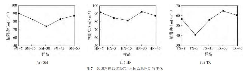 圖7超細(xì)粉碎后煤顆粒-水體系粘附功的變化