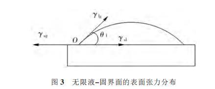 朱定一等通過設(shè)計(jì)一種在有限液-固界面上的潤(rùn)濕性表征體系,推導(dǎo)出在無限液-固界面系統(tǒng)中固相表面張力和液-固界面張力的計(jì)算方法,并且通過潤(rùn)濕角實(shí)驗(yàn)和計(jì)算,證實(shí)了在接觸角較大時(shí),該理論對(duì)固相表面張力的一致性。圖3所示為液相在無限固體平面上的潤(rùn)濕表征系統(tǒng)。其中γsl、γlg、γsg分別表示固-液、液-氣、固-氣3個(gè)界面上的表面張力,O為氣-液-固三相接觸點(diǎn),θ1為氣-液界面的切線與固-液界面的夾角,即接觸角。當(dāng)達(dá)到平衡時(shí),作用于潤(rùn)濕周邊的3個(gè)表面張力在水平方向的分力必為0,此時(shí)的平衡狀態(tài)方程,即Young方程為