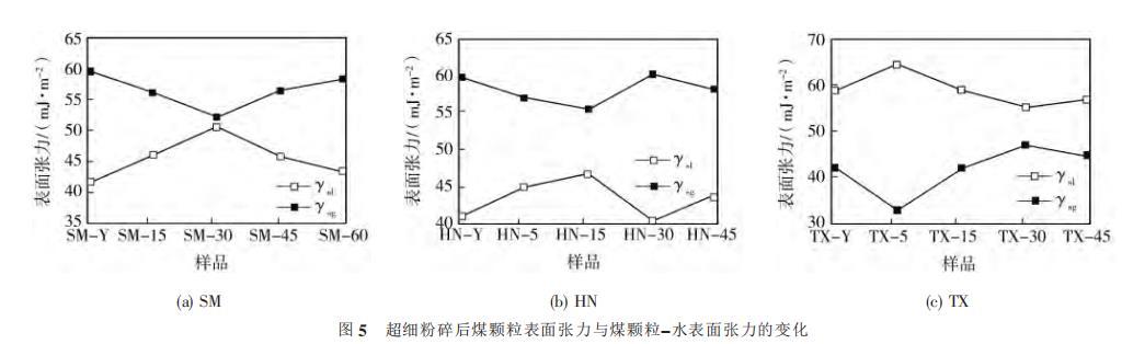 圖5超細(xì)粉碎后煤顆粒表面張力與煤顆粒-水表面張力的變化