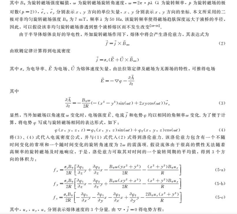 摘要:半導(dǎo)體晶體作為各類電子器件的基礎(chǔ)材料,它的發(fā)展對現(xiàn)代電子行業(yè)的發(fā)展起著重要的推動作用。為了探索生長高品質(zhì)晶體的優(yōu)化方案,建立了半浮區(qū)液橋的三維磁流體動力學(xué)模型,采用有限體積法數(shù)值研究了微重力環(huán)境下外加二極對非均勻旋轉(zhuǎn)磁場對液橋表面張力對流的控制作用。研究結(jié)果表明,由二極對非均勻旋轉(zhuǎn)磁場(7 mT, 50Hz)所產(chǎn)生的周向強迫攪拌作用,有效地提高了液橋的最大周向速度,同時抑制了液橋的最大軸向速度,該作用使無磁場作用下的三維液橋表面張力對流得到有效控制轉(zhuǎn)變?yōu)槎S軸對稱定常流動。
