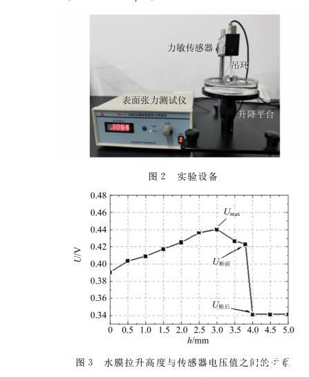 圖2是WBM-1A拉脫法液體表面張力實驗儀,用來測定純凈水的表面張力系數。實驗時采用標準吊環的內、外徑分別為d1=33.10 mm,d2=34.96 mm,平均直徑為d?=34.03 mm,平均周長為πd?=106.88 mm。該標準環拉出的水膜高度與力敏傳感器電壓讀數之間的關系,如圖3所示。可以看出,隨著水膜高度的增加,吊環拉力逐漸增加到最大(圖中Umax表示),然后慢慢減小,直至水膜斷裂。圖中U斷前和U斷后分別表示水膜斷裂時和斷裂后的瞬時電壓值。吊環的受力變化情況與之前理論分析一致。