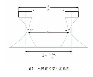 圖5給出了水膜直徑變小示意圖。吊環(huán)拉出的水膜,其內(nèi)表面、外表面都是雙曲面,但不對(duì)稱(chēng)。一般而言,外表面的曲率半徑較小,而內(nèi)表面的曲率半徑較大,2個(gè)曲面頂點(diǎn)處的位置(圖5中M和N所示)將偏離吊環(huán)內(nèi)、外徑的平均值d?=(d1+d2)/2,如圖5中的豎直虛線所示。所以水膜斷裂處的直徑d斷,將小于吊環(huán)的d?,即d斷 < d?。由表2數(shù)據(jù)可以看出,隨著吊環(huán)直徑的減小,對(duì)應(yīng)水膜的內(nèi)、外曲面的不對(duì)稱(chēng)程度增加,斷裂處水膜直徑的收縮程度("頸縮")增大,所以2個(gè)直徑的比值d斷/d?變小。