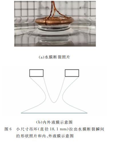 另一方面,對(duì)于尺寸較小的吊環(huán),如圖6所示,水膜的內(nèi)表面將連接在一起,只有外表面的表面張力起作用,但在計(jì)算公式中,仍以2πd?代入式(5)中,所以表面張力系數(shù)的計(jì)算值偏小。標(biāo)準(zhǔn)環(huán)的尺寸適中,環(huán)壁很薄,所以圖1(c)與圖1(d)水膜形狀近似相同,實(shí)際測(cè)量的F等于U斷前,因此計(jì)算得到的α2誤差很小??梢?jiàn),選用水膜斷裂點(diǎn)計(jì)算的表面張力系數(shù)的影響因素很多,實(shí)際斷裂點(diǎn)的瞬間位置、吊環(huán)尺寸、吊環(huán)厚薄等都是需要考慮的因素。