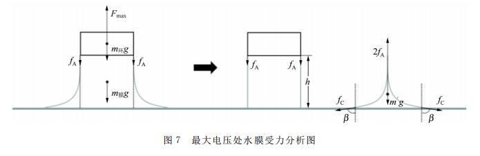 采用隔離法,對(duì)電壓最大值處的水膜進(jìn)行受力分析。圖7中虛線將水膜分成2部分,吊環(huán)正下方的水膜由于水分子相互吸引力附加在拉力Fmax中,而另一部分水膜的重力m′g,與2fA以及水膜與液面處的表面張力2fCcosβ,三者形成平衡狀態(tài),即受力分析與水膜斷裂時(shí)[圖1(d)]m2的受力相似。所以計(jì)算水膜的重力僅僅需要考慮吊環(huán)正下方的重力即可。另外,電壓最大值處的水膜穩(wěn)定性最好,拉升高度h容易測(cè)量。對(duì)于尺寸較小的吊環(huán)(πd?=78.2 mm),電壓最大值處,水膜的內(nèi)表面沒(méi)有連接在一起,仍然與液體表面接觸良好,所以測(cè)量的誤差也較小(Eα1=3.9%)。但是對(duì)于特別小的吊環(huán)(πd?=57.4 mm),水膜的內(nèi)表面連接在一起,其表面張力系數(shù)明顯偏小。