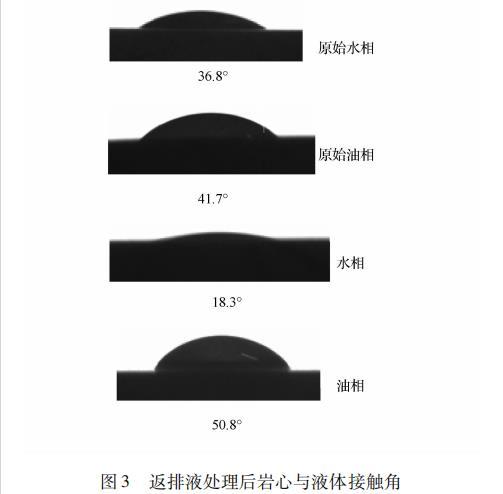 將同一塊巖心等分切割成厚度為1cm巖心片備用。將巖心放在返排液溶液中浸泡2h,取出風(fēng)干,測定巖心片浸泡前后的油、水兩相潤濕性變化。結(jié)果如圖3所示。