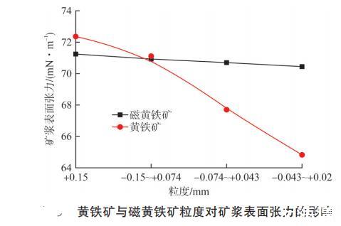 粒度影響顆粒比表面積,也會直接影響礦漿中難免離子的濃度,可能間接影響礦漿表面張力。在礦漿濃度 30%、pH=7、攪拌時間 3 min條件下,考察粒度分別為+0.15 mm、-0.15~+0.074 mm、-0.074~+0.043 mm、-0.043~+0.02 mm的黃鐵礦與磁黃鐵礦礦漿表面張力。