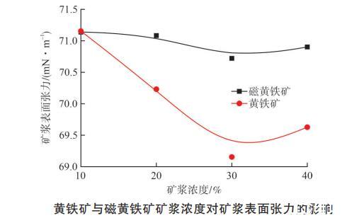 將粒度-0.074 mm的黃鐵礦與磁黃鐵礦配制成不同濃度的礦漿,考察礦漿濃度對礦漿表面張力的影響。