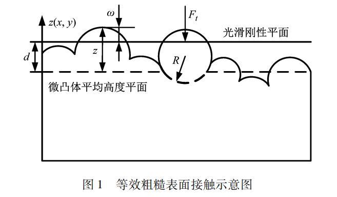 將兩隨機(jī)粗糙表面的接觸簡化為一等效粗糙表面與光滑剛性平面的接觸,如圖1所示。圖1中,d為剛性平面到微凸體平均高度平面的距離;z為微凸體的高度;R為微凸體的半徑;Ft為法向載荷。