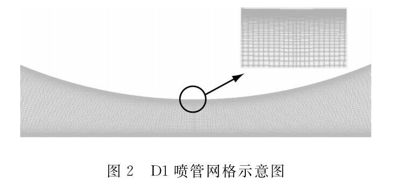 數值計算時,兩噴管的進、出口條件與 Dykas 的實驗工況完全一致,進口總壓為 98 kPa、總溫為 378.15 K,出口靜壓為 35 kPa,壁面均采用無滑移絕熱壁面邊界條件,計算網格采用結構化網格。為更好地捕捉到壁面邊界層的流動及噴管喉部附近蒸汽的凝結現象,對噴管壁面及喉部的網格進行加密。為保證模擬精度,2 個噴管壁面最大 y+ 均小于 5,網格質量在 0.85 以上。D1、D2 噴管網格數量分別為 42 萬和 38 萬。其中,D1 噴管的網格示意圖見圖 2。