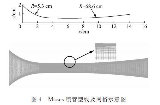 為了分析蒸汽進口參數對表面張力修正系數最佳取值的影響,筆者基于 Moses 等的對稱噴管開展研究。實驗噴管型線及網格見圖 4,亞音速區是半徑為 5.3 cm 的圓弧,跨音速區是半徑為 68.6 cm 的圓弧,噴管喉部位于 x=6.22 cm 處。數值模擬采用的網格為結構化網格,對壁面及喉部處的網格進行加密。噴管壁面最大 y+ 小于 5,網格質量在 0.7 以上。噴管網格數量為 28 萬。