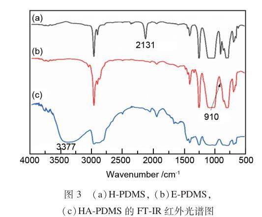 圖3為產(chǎn)物的紅外光譜圖。通過(guò)圖3(a)與(b)對(duì)比可以看出,圖3(a)中2127cm-1處硅氫鍵的伸縮振動(dòng)峰在圖3(b)中消失,表明環(huán)氧基團(tuán)成功連接到H-PDMS兩端。通過(guò)圖3(b)與(c)對(duì)比可以看出,圖3(b)中910cm-1處環(huán)氧基的伸縮振動(dòng)峰在圖3(c)中消失,并出現(xiàn)3377cm-1處羥基的伸縮振動(dòng)峰,表明二乙醇胺已將環(huán)氧基團(tuán)開環(huán),成功制備了HA-PDMS。