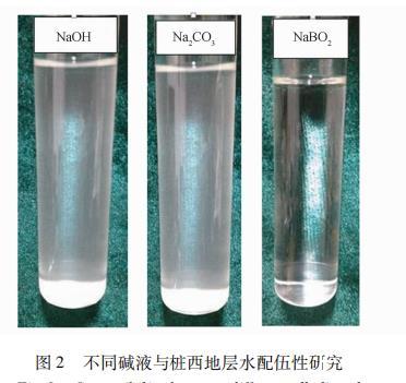 由上述研究結果可以看出,單一的表面活性劑不能使油水界面張力達到超低,因此可考慮加入堿,利用堿的協同效應,降低油水界面張力。樁西原油的酸值較高達到1.65 mg(KOH)/g,且地層水中Ca2+、Mg2+離子含量較高。應用常規堿,如氫氧化鈉、碳酸鈉,會產生結垢問題。偏硼酸鈉是一種弱堿,可以螯合Ca2+、Mg2+,與地層水混合不會生成沉淀,配伍性較好(0.1%不同堿與地層水配伍性情況見圖2)。
