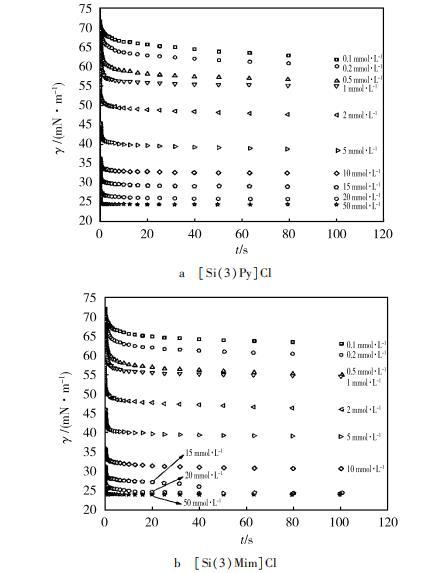 分別配制不同濃度的[Si(3)Py]Cl和[Si(3)Mim]Cl水溶液,25℃在芬蘭Kibron公司生產(chǎn)的Delta-8全自動(dòng)高通量表面張力儀上測(cè)定10 ms~100 s的動(dòng)態(tài)表面張力。