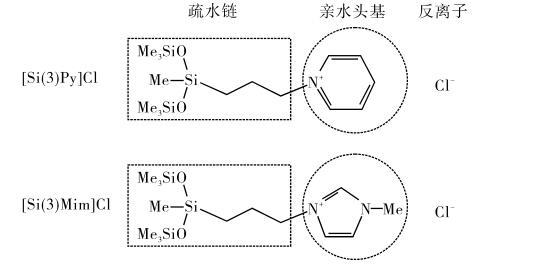 近年來(lái),已有多種表面活性劑在水中的吸附機(jī)理被深入研究,然而這些表面活性劑分子大多是直鏈且頭基較小,對(duì)于含有支鏈且頭基較大的有機(jī)硅離子液體型表面活性劑水溶液的動(dòng)態(tài)表面張力的研究卻鮮有報(bào)道。為此,筆者主要研究三硅氧烷吡啶類離子液體([Si(3)Py]Cl)和三硅氧烷咪唑類離子液體([Si(3)Mim]Cl)水溶液在不同溫度和濃度下的動(dòng)態(tài)表面張力,并初步探討2種離子液體在水中的吸附機(jī)理,旨在為這2種離子液體的進(jìn)一步應(yīng)用提供理論基礎(chǔ)。2種離子液體的分子結(jié)構(gòu)示意圖如下:
