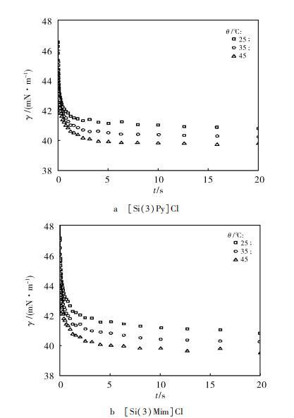 在Delta-8全自動(dòng)高通量表面張力儀上測(cè)定10 ms~100 s的一定濃度的[Si(3)Py]Cl和[Si(3)Mim]Cl水溶液分別在25,35和45℃時(shí)的動(dòng)態(tài)表面張力。
