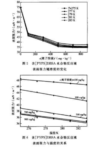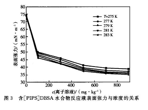 隨著溫度的升高,表面張力有所降低。在275~283K,溫度對表面張力影響不大。從圖1、圖2可知:溶液濃度是影響含[MIMPS]DBSA水合物反應液表面張力的主導因素。因超過700mg/kg后,水合物反應液表面張力降低效果很小。綜合考慮用量和效果,以c=700mg/kg為最佳濃度。