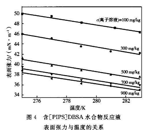 濃度一定時,含[PIPS]DBSA水合物反應溶液的表面張力隨溫度的關系如圖4所示。由圖4可以看出:在275~283K,表面張力隨溫度變化比較平緩,總體呈隨溫度升高而下降趨勢,基本是線性減函數關系。