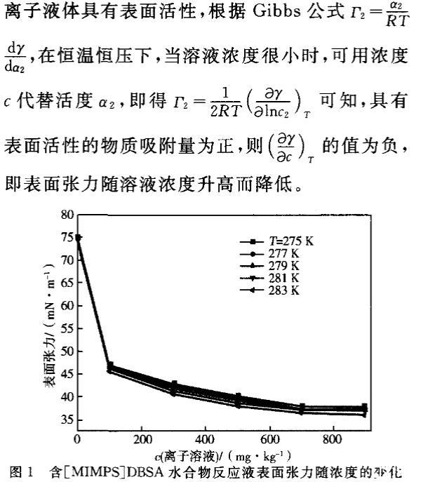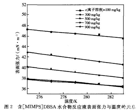圖2為含[MIMPS]DBSA水合物反應液表面張力與溫度的關系。