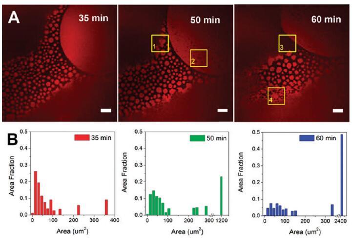 圖5。蛋白質(zhì)島隨時(shí)間的聚合。(A)導(dǎo)入后35、50和60分鐘拍攝的共焦熒光圖像。比例尺:20μm.(B)蛋白質(zhì)島大小分布的直方圖。初始亞期濃度為[HSA-TR]=0.50 mg/mL和[F-127]=0.015 mg/mL。ROI-1表示一個(gè)區(qū)域(黃色框),其中小的蛋白質(zhì)島與周?chē)牡鞍踪|(zhì)島結(jié)合形成一個(gè)較大的島;ROI-2表明該區(qū)域形成了小黑洞;ROI-3表示在表面活性劑富集區(qū)域的邊界處的運(yùn)動(dòng);ROI-4顯示了小的蛋白質(zhì)島合并成網(wǎng)狀網(wǎng)絡(luò)的地方。