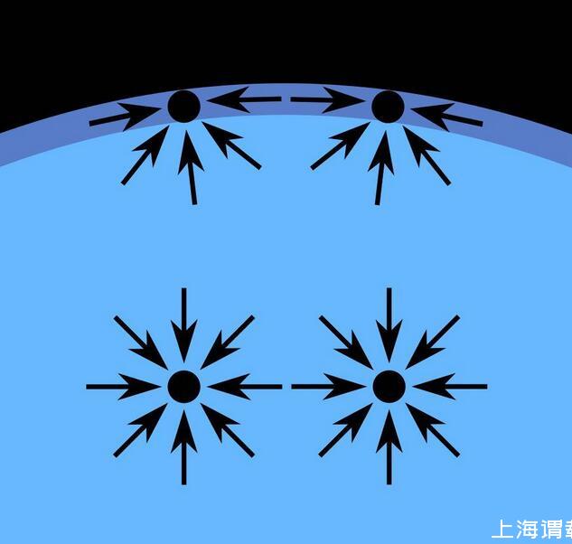 表面張力是流體表面存在的可能收縮到最小表面積的趨勢(shì)力;它是液體分子由于凝聚力相互吸引而在其表面形成的內(nèi)向力;它就像是一張覆蓋在液體表面被拉伸的彈性薄膜,可以承受一定重量的外在壓力。
