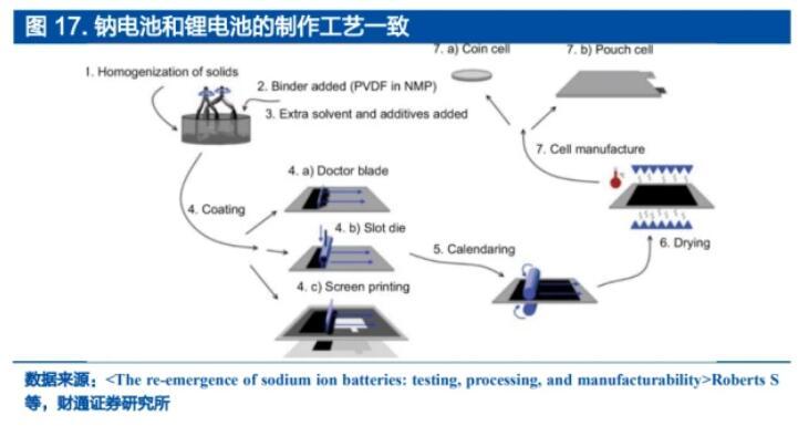 鈉離子電池的設備可以采用鋰離子電池的生產設備。鋰離子電池的生產設備主要分為針對電極制片工序的前端設備、覆蓋電芯裝配工序的中端設備和覆蓋電芯激活化成、分容檢測以及組裝成電池組等工藝的后端設備。鈉離子電池的制造工藝和設備與鋰電池兼容,只需要對設備進行升級即可用于鈉電池生產,需要投入的設備成本較低。